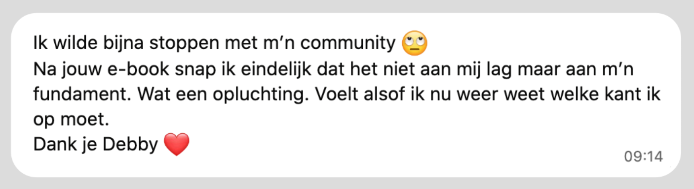 Geen theorie, maar scherpe inzichten uit de praktijk herkenbaar, pijnlijk eerlijk en precies de momenten waar het in communities misgaat. Zodat jij ziet wat je nu misschien nog over het hoofd ziet. -